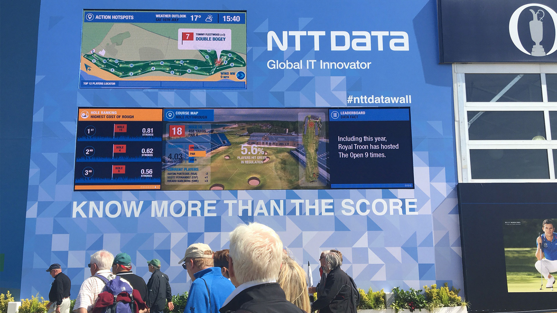 The NTT DATA Wall utilized the R&A live data feed - reported directly from the course - and translated it into a fully animated data-rich visual experience on a huge hi-res screen, adding live social media, word clouds and geo-located tweets. We also built a digital "second screen" experience for fans of the sport and NTT DATA corporate guests to engage with the live data at home.